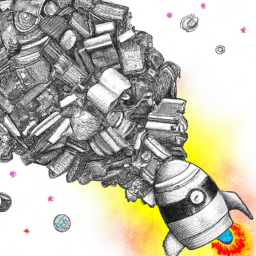 Una favola con astronave piena di libri si moltiplicano fino ad esplodere. La nave si solleva in volo, portando con sé centinaia di libri che si moltiplicano per effetto della gravità. La situazione diventa insostenibile, finché la nave non esplode.
