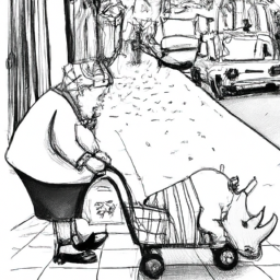 Una vecchina andava a fare la spesa, quando incontrò un rinoceronte. La vecchina schiacciò accidentalmente la povera creatura, che si lamentò molto. La vecchina si scusò e andò a casa, pensando che forse la bestiola era morta. Quando tornò a casa, trovò la bestiola che la aspettava con un sorriso. La vecchina rimase scioccata, ma felice.