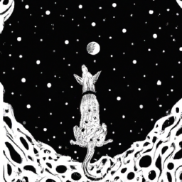 una vecchia signora aveva un cane sulla luna. Ogni notte, quando andava a letto, si sdraiava sul fianco del suo cane e gli diceva: "Ti amo, cane sulla luna". Alla fine della sua vita, la vecchia signora morì e il cane sulla luna continuò a vivere nella sua casa.