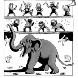 Un giorno, sette cani e un elefante si trovarono per strada. I cani si misero a correre e il elefante si distrattamente in mezzo a loro. I cani continuarono a correre e il elefante continuò a camminare. Alla fine, i cani arrivarono in una foresta e il elefante in una piana. I cani si fermarono e guardarono il elefante, ma lui continuò a camminare. Alla fine, i cani decisero di seguire il elefante.